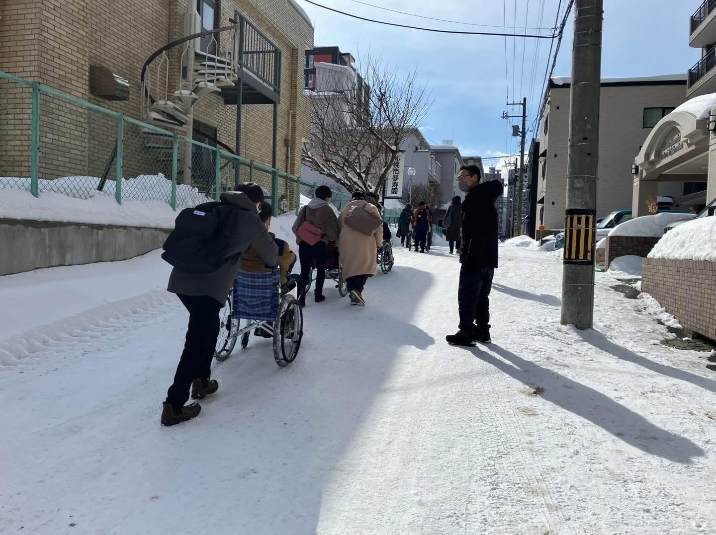 雪道での移動サポートは、室内とは比べものにならない難しさがあります。特に悪路の中で安全を確保するための工夫や、寒さ対策について、実践を交えながら意見を出し合い、協力しながら学びました。